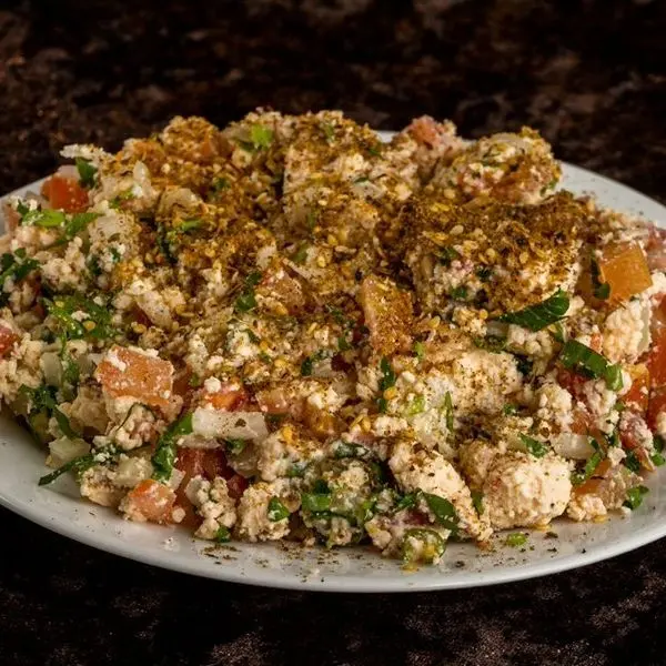 Queijo árabe feito com leite de cabra, temperado com tomate, cebola e salsa acompanha 1 pão.