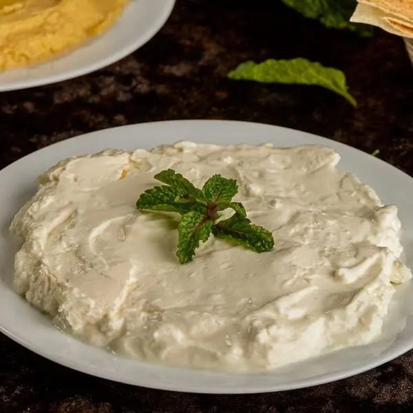 Queijo árabe feito com leite de cabra, temperado com tomate, cebola e salsa acompanha 2 pães.
