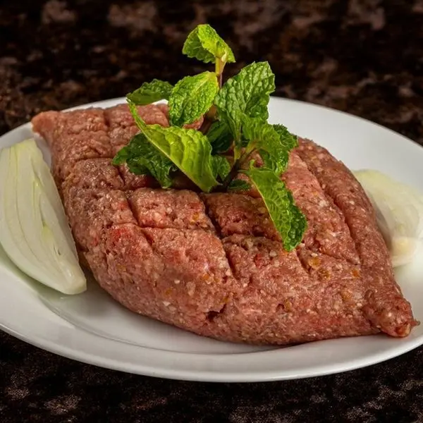 Carne moída temperada com trigo, sal e azeite, acompanha 2 pães
